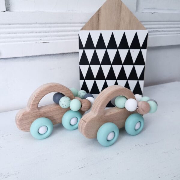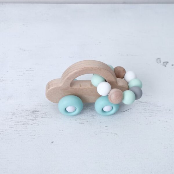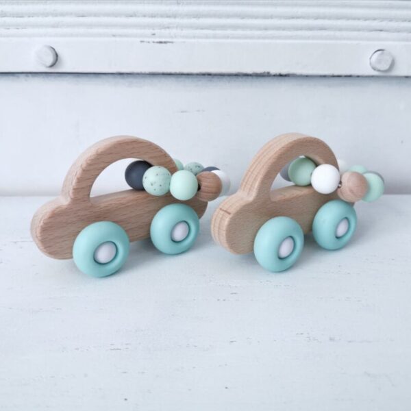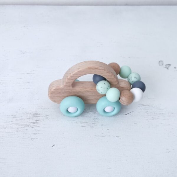 Greifling “Auto” aus Buchenholz mit Silikonperlen und Silikonrädern. Zum Spielen, Entdecken oder als Beissring für zahnende Babies.