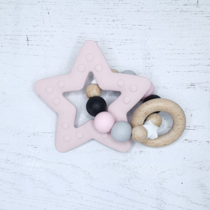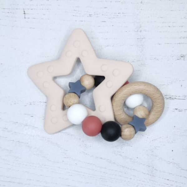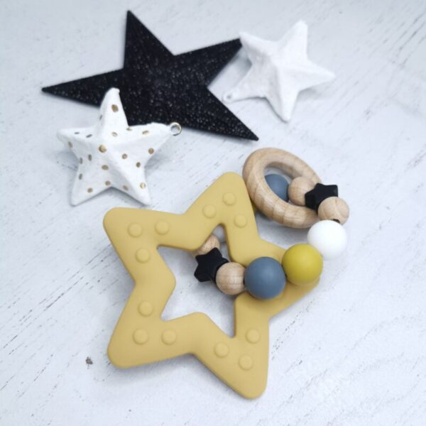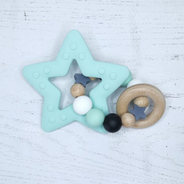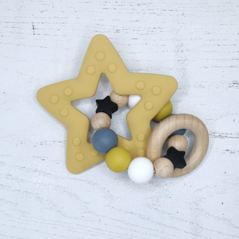 Der Greifling “Stern” aus Silikon und Buchenholz ist ideal zum Spielen, Entdecken oder als Beissring für das zahnende Baby.