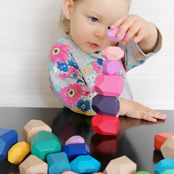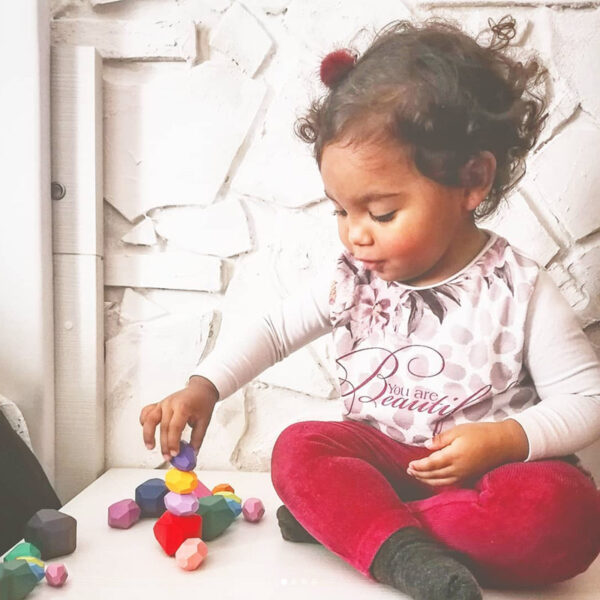 Ein von Montessori inspiriertes Holzspiel (“Lernen wird für dein Kind immer ein Moment des Spielens sein”), welches Kreativität, Motorik und Logik fördert. Die bunten Klötzchen erinnern mit den unkonventionellen Formen an grosse Edelsteine und laden zu völlig freiem Spiel ein. Die Kartonverpackung enthält einen praktischen, robusten Leinensack, in welchem die Bauklötze versorgt werden können.