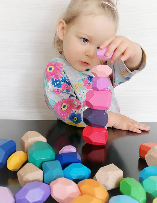 CE zertifiziertes Spiel aus aus FSC-Buchenholz, bemalt mit umweltfreundliche Farben in allen Facetten des Regenbogens.