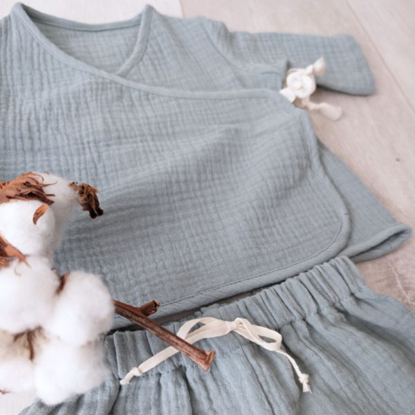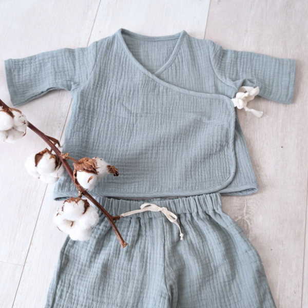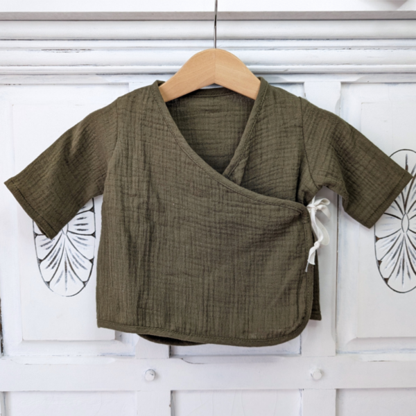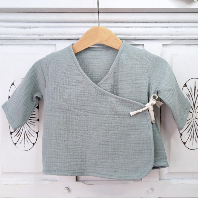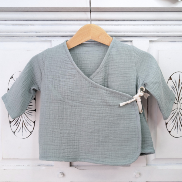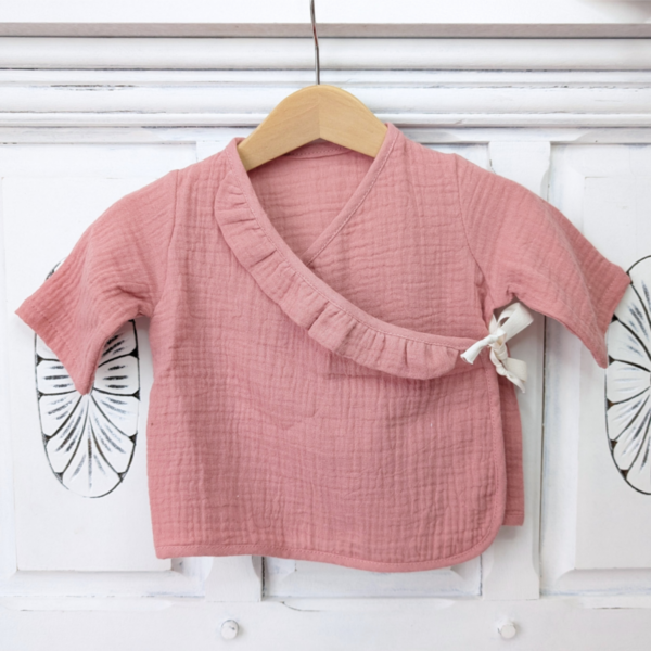 Diese Baby-Wickelbluse aus weichem und atmungsaktivem Bio-Baumwollemusselin ist perfekt für dein Baby. Der Wickelstil und der Druckknopf machen das Anziehen super einfach. Das Oberteil sitzt bequem und lässt deinem Kind viel Bewegungsfreiheit. Passende Hosen und Shorts findest du auch im Shop: hier gehts zu den Hosen und hier zu den Shorts. Für die Girls gibt es die rosa Variante mit Rüschen